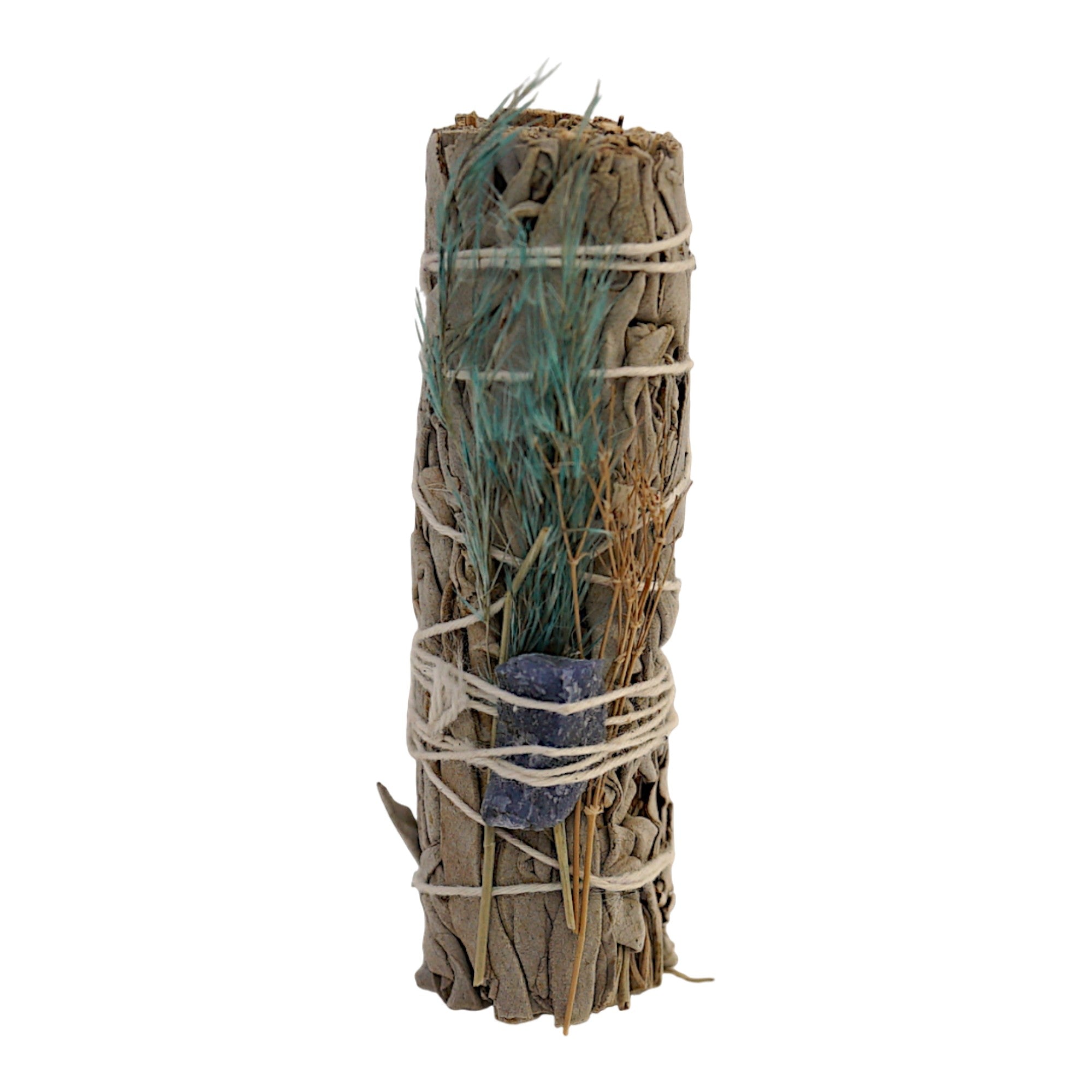 Find your voice and your peace with this beautiful 4-inch White Sage Smudge Stick. This unique bundle features a powerful Sodalite crystal stone nestled among the sage and dried flowers. It offers a harmonious blend of deep purification and soothing energy, making it an essential tool for clearing the mind and opening the path to honest communication.